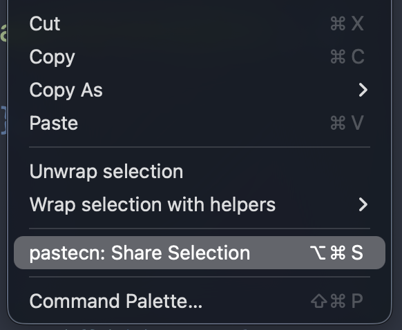 Right-click on selected code to access the "pastecn: Share Selection" option directly from the editor context menu. This appears only when text is selected.